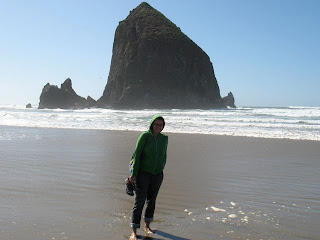 We drove to Cannon Beach on sunday! I thought it would be a scenic drive, but it turns out to be kind of a sad one, with all the deforestation everywhere. The coast, however, was quite lovely. It was chilly, but I had to take off my socks and shoes and walk along the shore. It's just one of those things that you have to do (Nik didn't believe me). It was such a nice beach and the water was sparkling and so clear. High tide was coming in, but in such a peculiar way. Very irregular, and taking quite a few people by surprise who were laying out on blankets! I would love to come back there or to other nearby areas along the coast on a hot summer day and stay for a couple days.